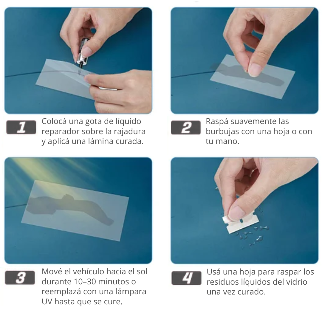 Nuestro líquido reparador de vidrios rellena y sella grietas en minutos, ayudándote a evitar gastos innecesarios en talleres o reemplazos.
